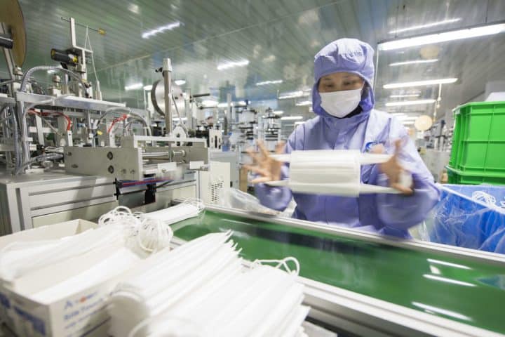 Chinese workers manufacture surgical face masks for prevention of the new coronavirus and pneumonia at the plant of a medical material company during the Chinese New Year or Spring Festival holiday in Hai'an, Nantong City, east China's Jiangsu Province on January 28th, 2020. (Photo by Xu Jingbai / Costfoto/Sipa USA) (Xu Jingbai / Costfoto / IPA/Fotogramma, Nantong - 2020-01-28) p.s. la foto e' utilizzabile nel rispetto del contesto in cui e' stata scattata, e senza intento diffamatorio del decoro delle persone rappresentate
