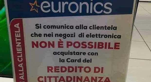 Nelle ultime ore sta circolando su internet la fotografia di un cartello all’ingresso di un negozio Euronics che vieta gli acquisti con la carta del reddito di cittadinanza, almeno fino ad indicazioni più chiare del governo, soprattutto nel reparto tv. Al momento non è stato ancora accertato se si tratti di un fake perché non ci sono direttive in questo senso ai piani alti della catena di elettronica (che, eventualmente, invitiamo a smentire la notizia). Insomma, se fosse vero, il cartello esprimerebbe l’iniziativa di un negozio della catena e in tutta Italia ce ne sono tantissimi. Quello che è importante in questa sede è sottolineare il rischio che un negozio possa rifiutare il pagamento con la carta RdC, se non vende beni di prima necessità.
