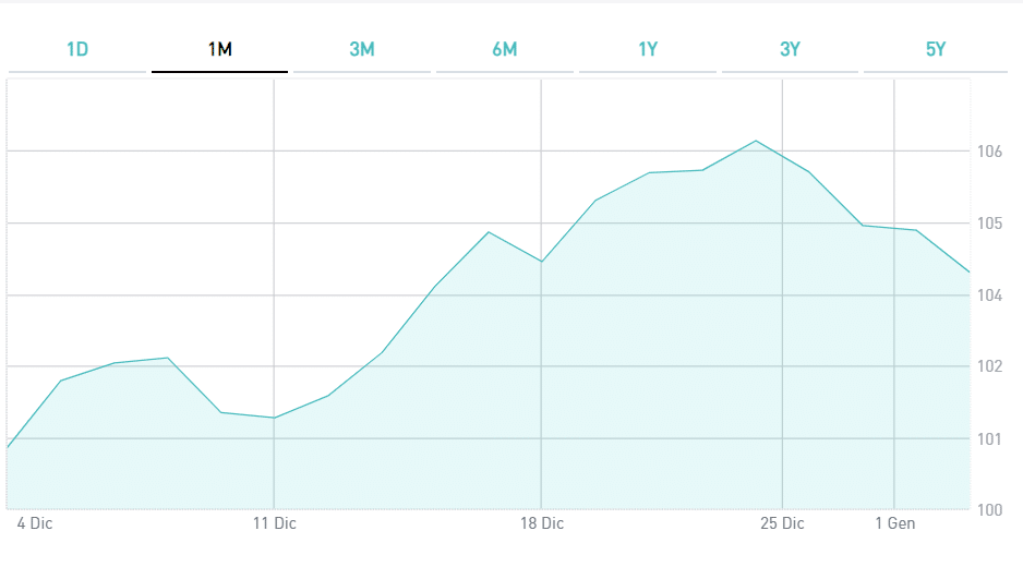 Ovviamente, se la risalita dovesse superare le attese, magari oltrepassare anche la soglia del 3%, il rendimento decennale rischierebbe di salire ulteriormente verso quota 4%. Viceversa, se le previsioni dovessero essere smentite al ribasso. Considerate il BTp 2034 raggiungeva il suo apice nell’ultima seduta pre-natalizia ad una quotazione di 106. E’ sceso sotto 104.