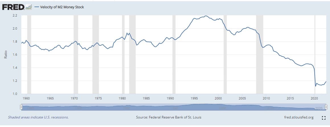 Nel mese di agosto – ultimo mese disponibile per i dati – M2 crebbe del 3,8% su base annua. Questo significa che, nel caso di un V in accelerazione a 1,45, l’inflazione americana tendenzialmente salirebbe di un altro 1%, anziché ripiegare. Se V tendesse, poi, ai livelli pre-2008, l’inflazione aumenterebbe del 3%. Al di là della precisione sui numeri, il senso è quello: se V crescesse, renderebbe molto più complicato il compito delle banche centrali.