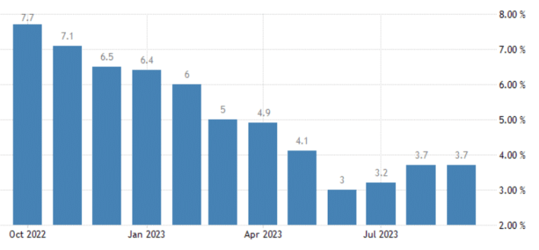 Il semplice fatto che l’inflazione sia rimasta invariata può diventare motivo per indurre la Federal Reserve ad un ultimo aumento dei tassi per il prossimo 13 dicembre, giorno in cui si terrà l’ultimo board dell’anno. Le aspettative si sono surriscaldate anche con riferimento al primo appuntamento dell’anno prossimo. In pratica, il mercato considera ancora marginali le probabilità che i tassi FED salgano dall’attuale range del 5,25-5,50% per l’1 novembre, mentre scontano tale scenario come più probabile a dicembre e, soprattutto, per gennaio.