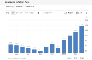 In pratica, l’unica fonte di esportazione del Venezuela sta venendo totalmente meno. L’afflusso di dollari, già ridotto al lumicino, si è prosciugato. E così le importazioni scarseggiano e l’inflazione torna a salire. Pensate che era diminuita fino al 25,75% nel settembre scorso, un livello bassissimo per un’economia in cui i prezzi erano arrivati a salire fino al 345.000% su base annua nel febbraio 2019. Ad aprile di quest’anno, però, risultava risalita al 172%, ai massimi da 16 mesi.
