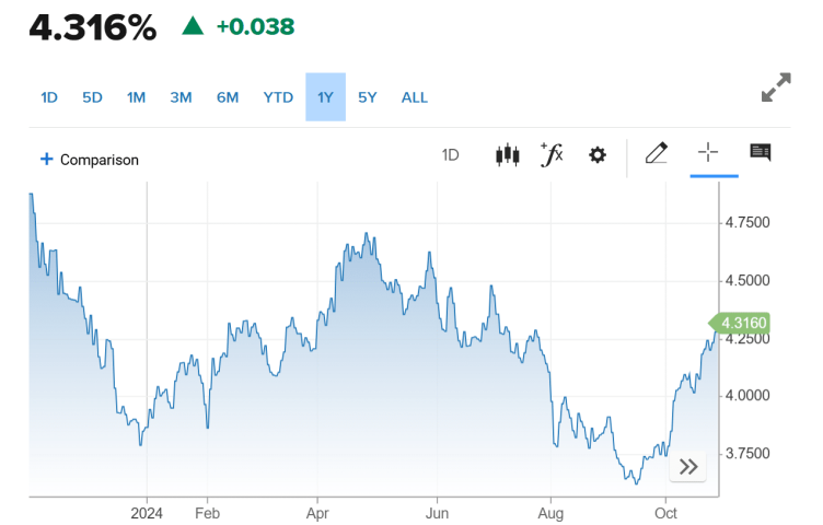Passare da un rendimento di poco superiore al 3,60% a più del 4,30% nel giro di poche settimane è qualcosa che capita raramente al mercato dei bond sovrani americani. Il Treasury a 10 anni ha accusato un crollo di prezzo rispetto ai valori a cui si era portato alla metà di settembre. Gli investitori restano convinti che la Federal Reserve taglierà i tassi di interesse per altre due volte quest’anno: la prossima settimana, all’indomani delle elezioni presidenziali, e a dicembre. In tutto, un altro mezzo punto percentuale in meno per il costo del denaro. Gli analisti finanziari, invece, invitano ad una maggiore prudenza e ieri è intervenuto niente di meno che il CEO di BlackRock, Larry Fink, per avvertire che l’allentamento monetario sarà probabilmente meno veloce di quanto previsto sinora dal mercato.